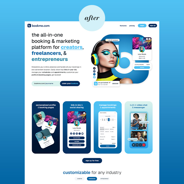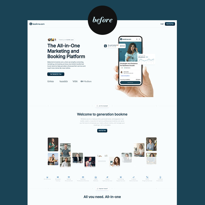 We began this project by refining their existing logo and completely re-imagining their entire visual identity. This included updating their brand colors, typography, and imagery style to feel more modern, polished, and approachable, while still staying true to their core values and vision. We created and introduced a streamlined visual style that brings clarity and warmth to the brand, making it feel more accessible to users and more competitive in the market. The result: a cohesive and inviting brand that better reflects Bookme’s innovation and accessibility.