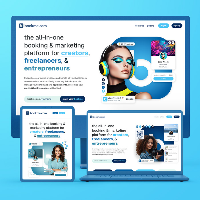 Bookme, an all-in-one booking and marketing platform, partnered with us to lead a complete brand and digital refresh. Our work included a refined & refreshed visual identity, modernized brand assets, and a comprehensive new brand guide to ensure a consistent look and feel across every touchpoint. Alongside the refreshed branding, we designed a custom website and mobile experience with an intuitive, user-focused interface. To further support their growth, we developed a suite of marketing materials — from social campaigns to email templates — helping Bookme connect more effectively with their audience and elevate their entire digital presence overall.